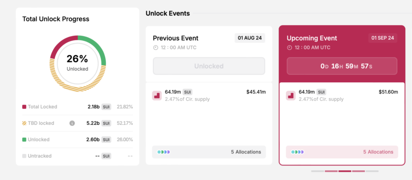 On September 1, Sui will unlock 64.19 million tokens. These tokens, worth approximately $51.6 million, account for 2.47% of its circulating supply. The distribution of these tokens will be as follows: