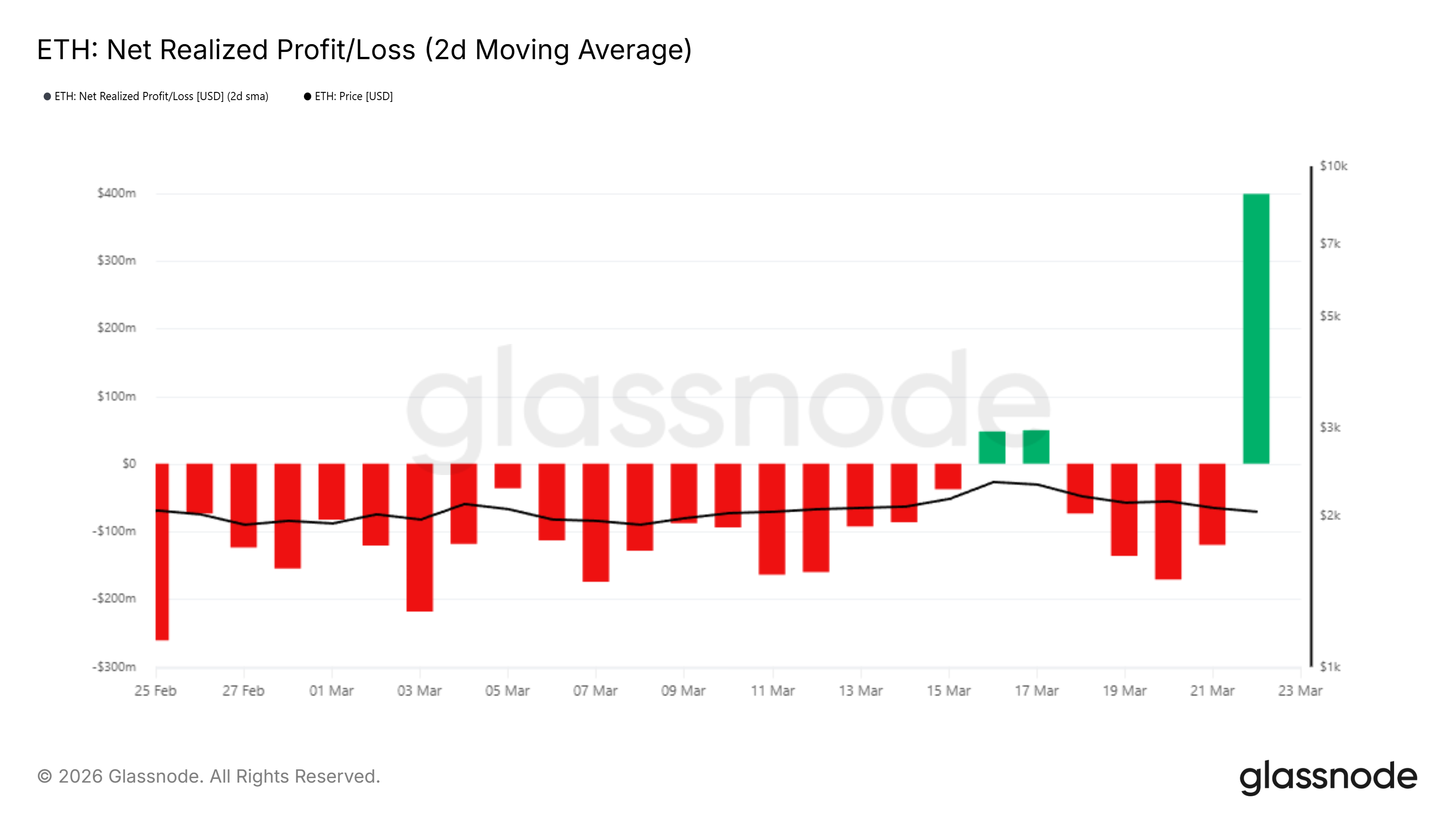 Adding weight to the case for a floor, Net Realized Profit/Loss data from Glassnode shows the single largest positive reading of the entire period on March 23, approximately +$380 million. After six weeks of predominantly red bars, this spike means buyers are now realizing profits.