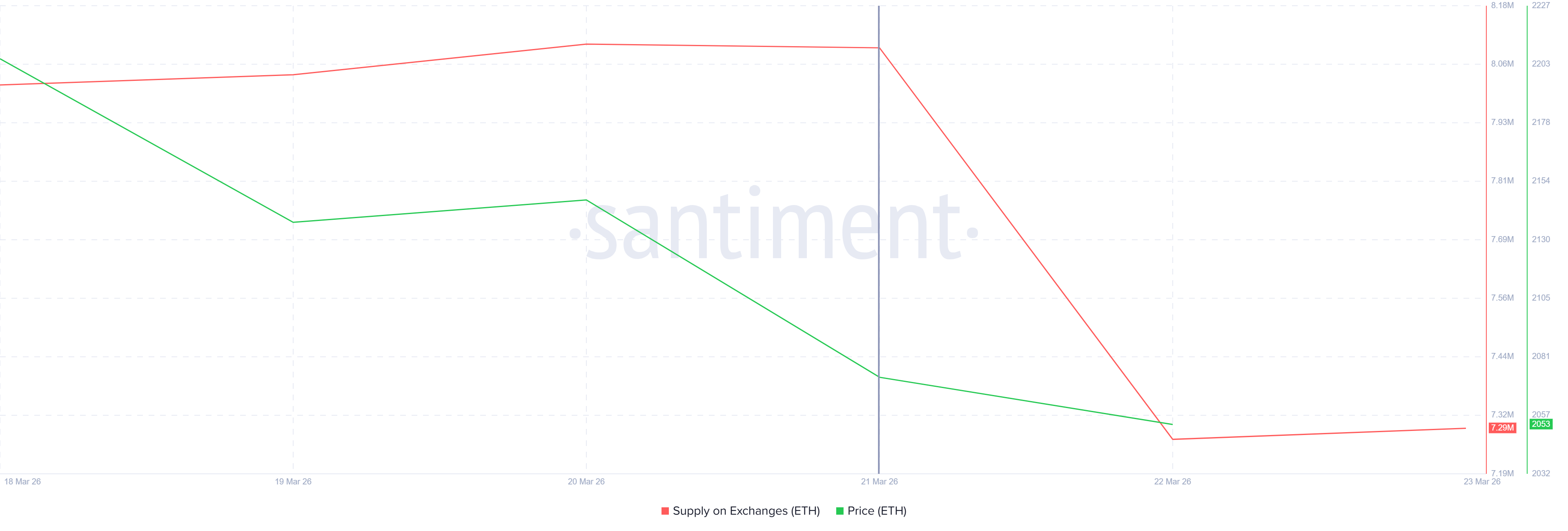 Despite the whale-driven selloff, exchange supply data reveals a powerful counter-move. Between March 21 and 22, approximately 870,000 $ETH was withdrawn from all exchanges — dropping total exchange supply from roughly 8.12 million to 7.29 million $ETH.