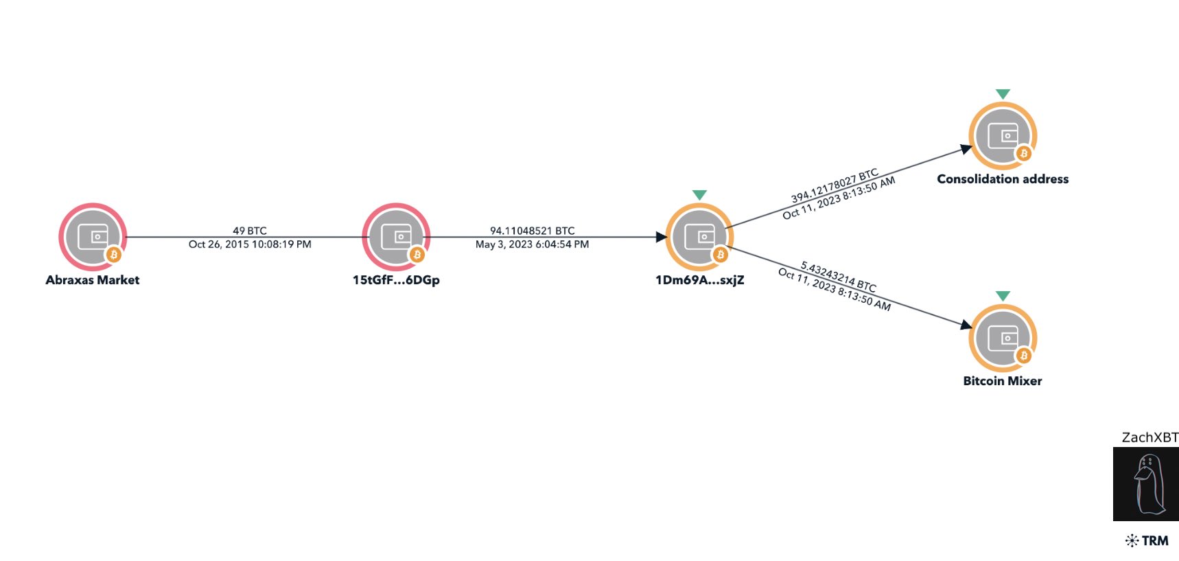 “An entity moved ~4800 BTC ($144 million) originating from Abraxas darknet market which exit scammed in Nov 2015 after beforehand sitting dormant. They consolidated funds and likewise deposited [them] to a Bitcoin mixer. This graph exhibits an instance of the actions from one of many addresses.”