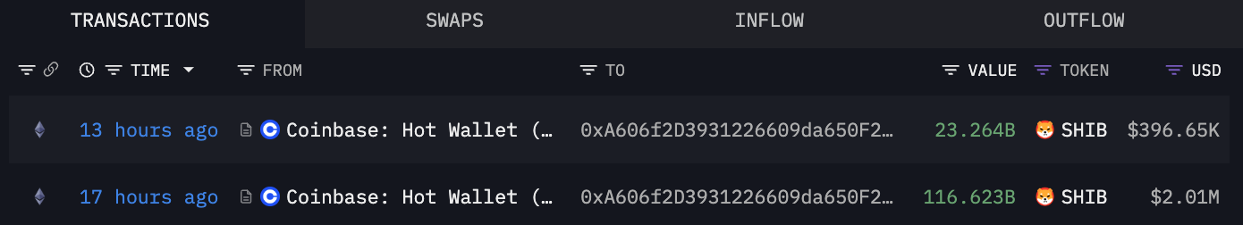 The tokens were withdrawn in two tranches, with the first transfer of 116.623 billion SHIB, followed by an additional 23.26 billion SHIB.