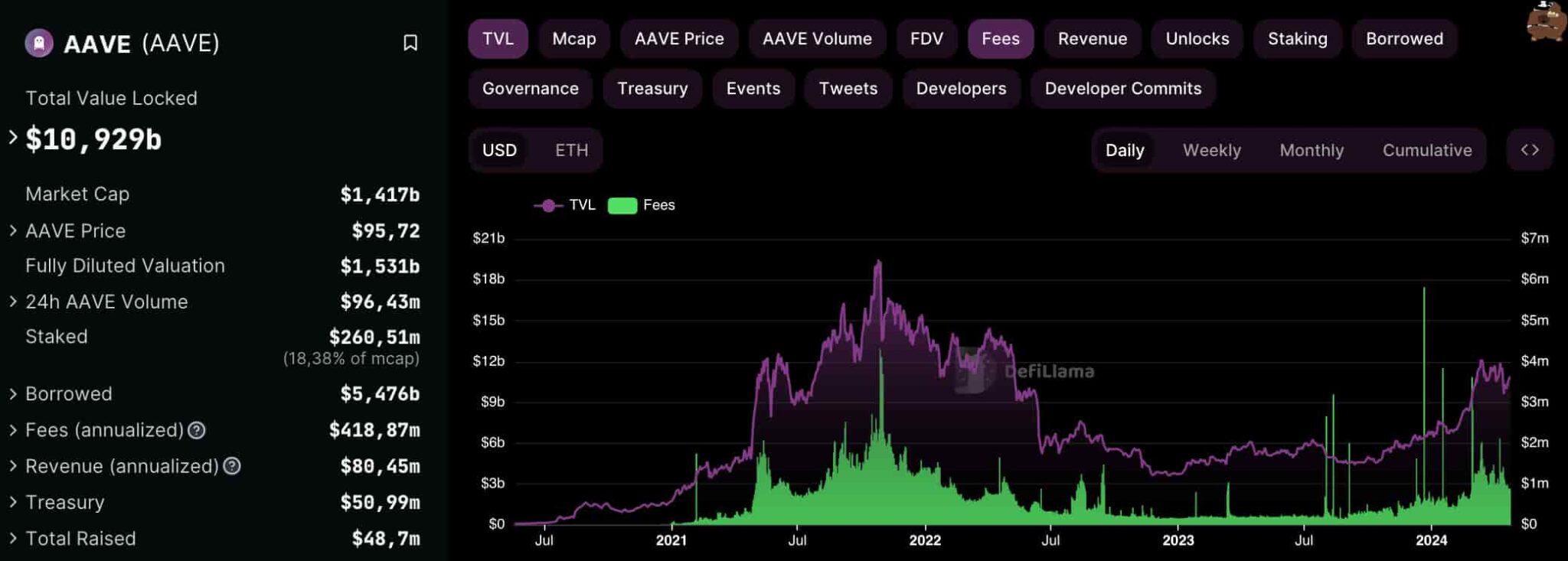 Notably, the protocol has $10.93 billion in total value locked (TVL), while AAVE has a $1.41 billion capitalization. This translates to a 0.15 MCap/TVL rate, which usually indicates an oversold asset with medium-to-long-term potential.