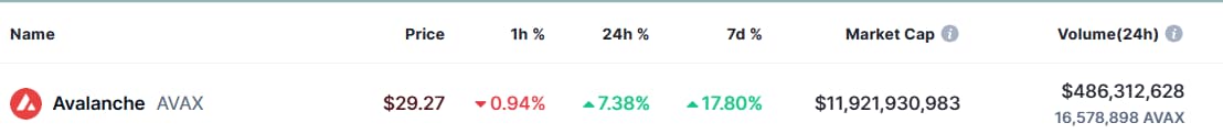 Currently priced at $29.47 with a market cap of approximately $12 billion, AVAX has gained 7% in a single day and 17% over the past week.