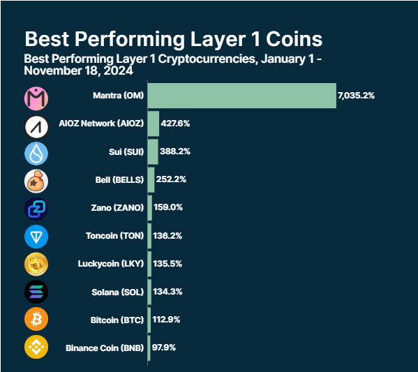 Blockchain analytics and crypto price tracking platform Coingecko has released an insight into the performance of Layer 1 (L1) tokens. According to the analysis, L1 tokens have soared by over 7,000% since January, driven by “renewed enthusiasm” in the crypto market post-US elections.