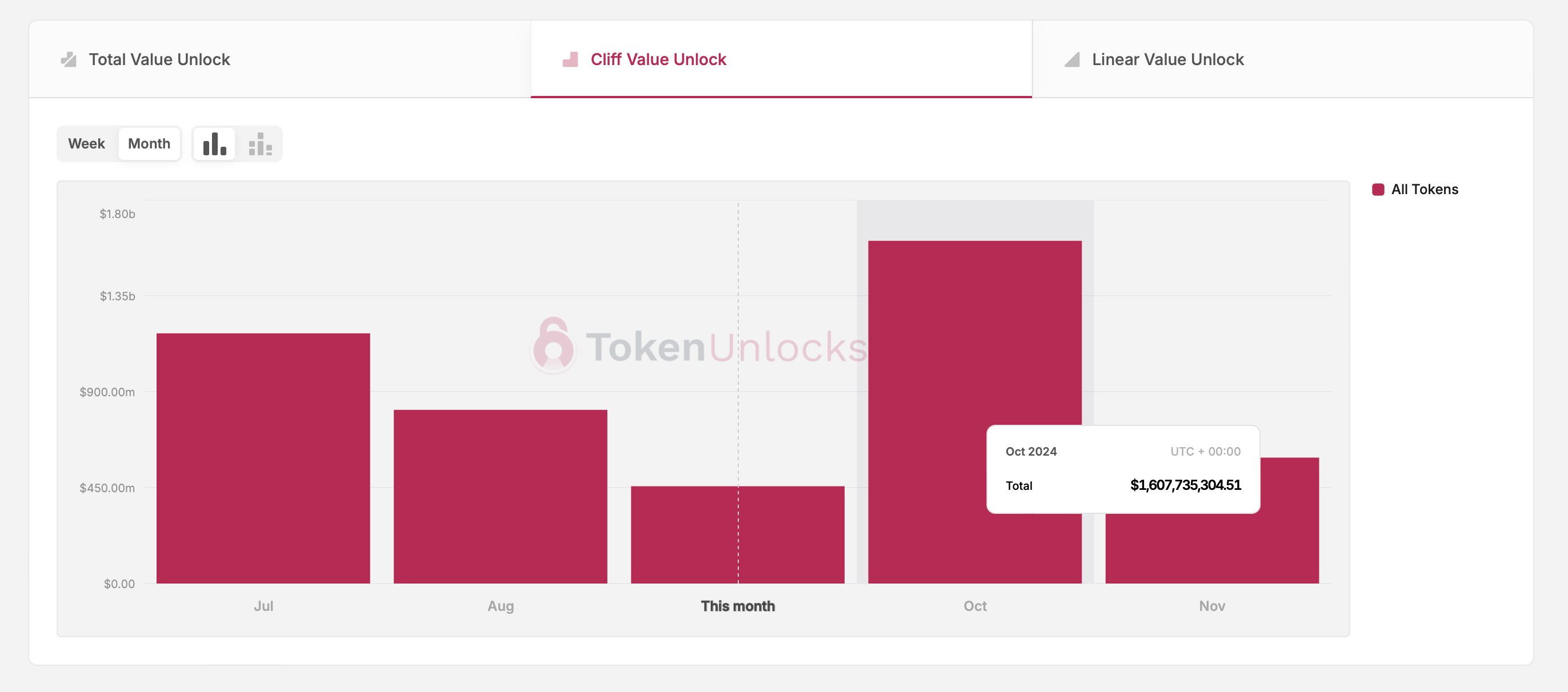 Data from TokenUnlocks indicates that approximately $1.6 billion of this month’s token unlocks are classified as cliff unlocks. In the context of token unlock events, cliff refers to tokens set to release on a schedule that’s more periodic than daily, such as weekly, monthly, or yearly.