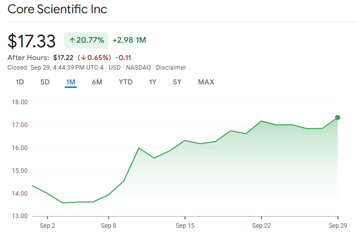 In the meantime, CoreWeave has a definitive agreement to acquire Core Scientific in an all-stock transaction valued at approximately $9 billion, significantly higher than the $5.2 billion market cap shares had at the end of September.