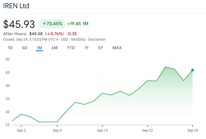 IREN Stock Price Chart Over The Past Month. Source: Google Finance