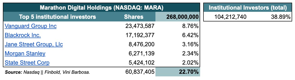 These five institutional investors sum up to 60,837,405 shares and own 22.7% of Marathon Digital Holdings.