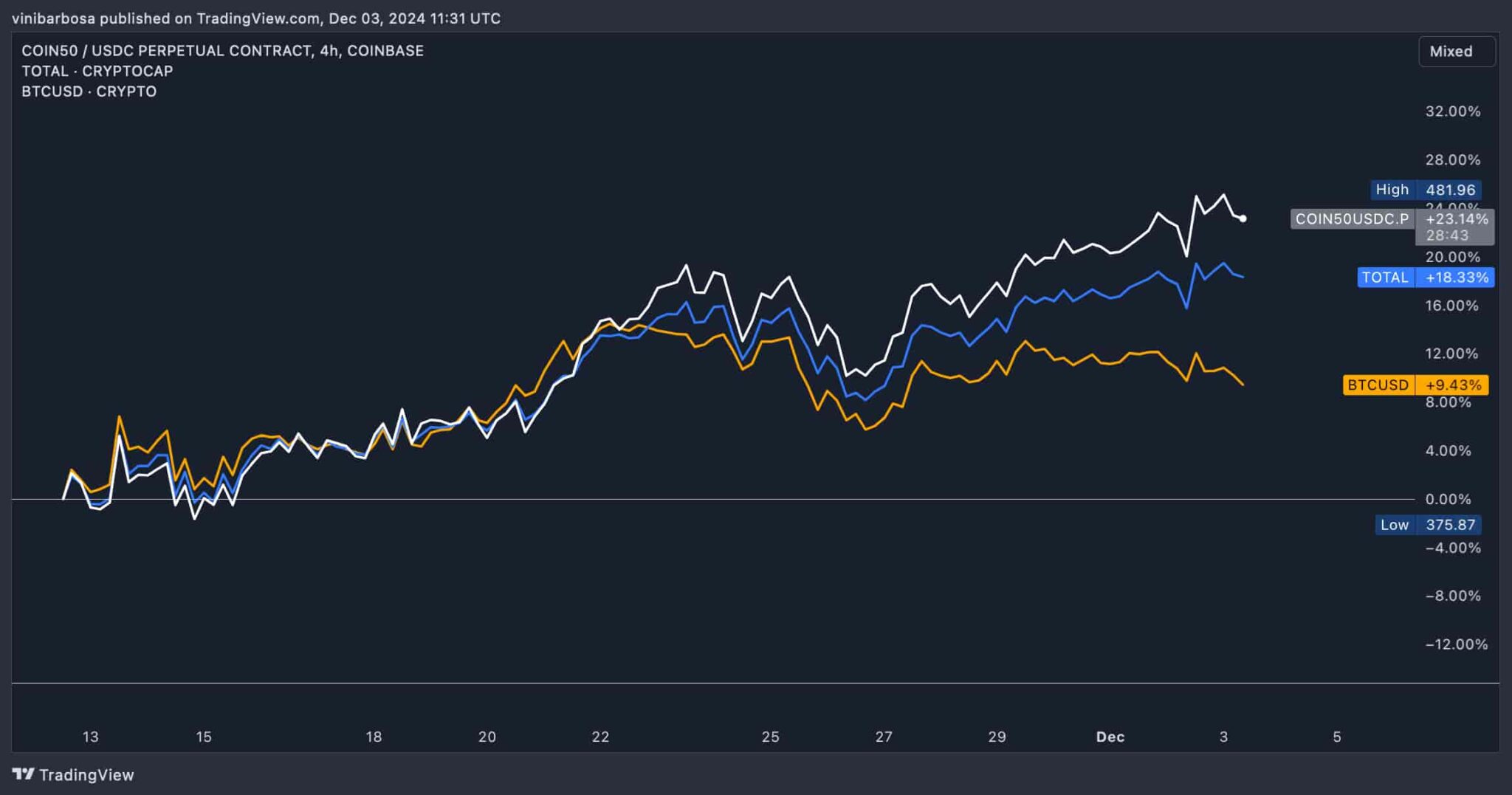With quarterly rebalances, the Coinbase 50 Index currently consists of 50 cryptocurrencies weighted by their circulating market cap. In particular, the top three assets—BTC, Ethereum (ETH), and Solana (SOL)—account for 85% of the total allocations. Each has 50%, 28.8%, and 6.4% of the COIN50 weight, respectively.
