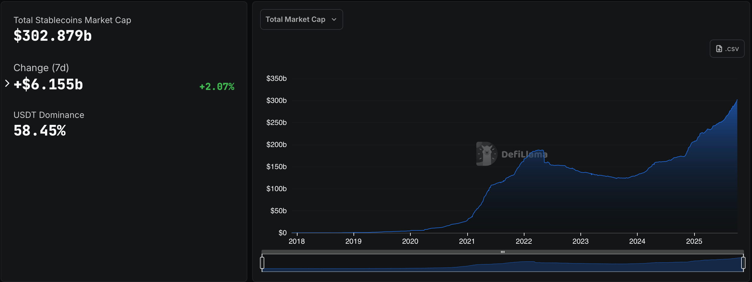 Between Sept. 28 and Oct. 5, 2025, the fiat-pegged token economy fattened up by more than 2%, with another $6.155 billion worth of stablecoins entering circulation. As of Sunday, the sector’s total value hovered at $302.879 billion, according to defillama.com’s stablecoin stats.