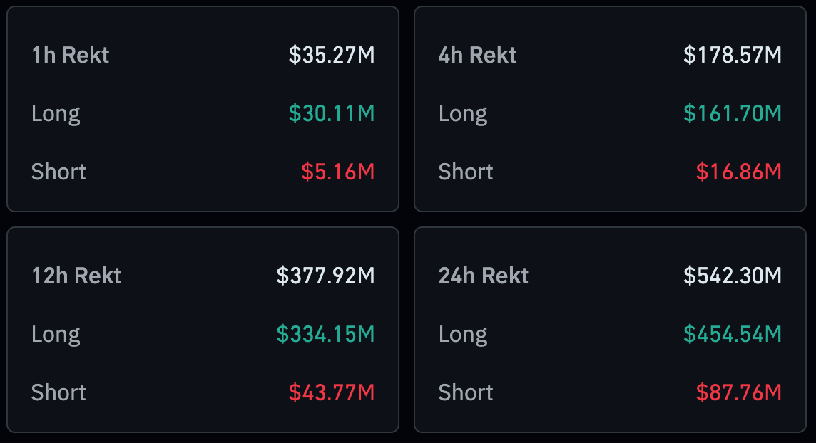 Most liquidations were longs at $454 million, with just $87 million in short liquidations. Bitcoin made up $156 million of the total liquidations, according to Coinglass, as of press time.