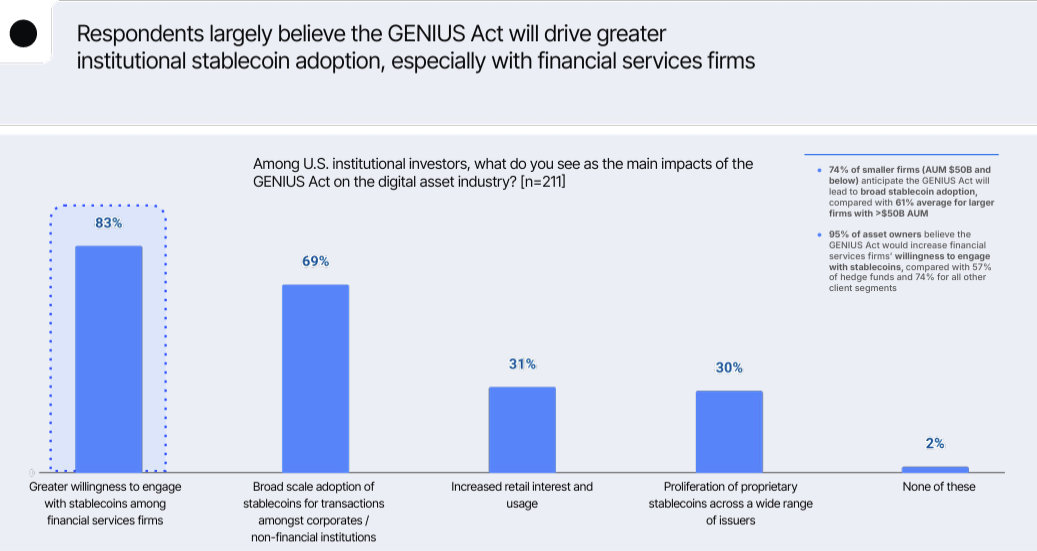 Part of that momentum is being driven by US regulatory developments, with 83% of respondents saying the passage of the GENIUS Act will increase financial institutions’ willingness to engage with stablecoins. More than two-thirds (69%) said the law will drive broader adoption of stablecoin-based transactions.