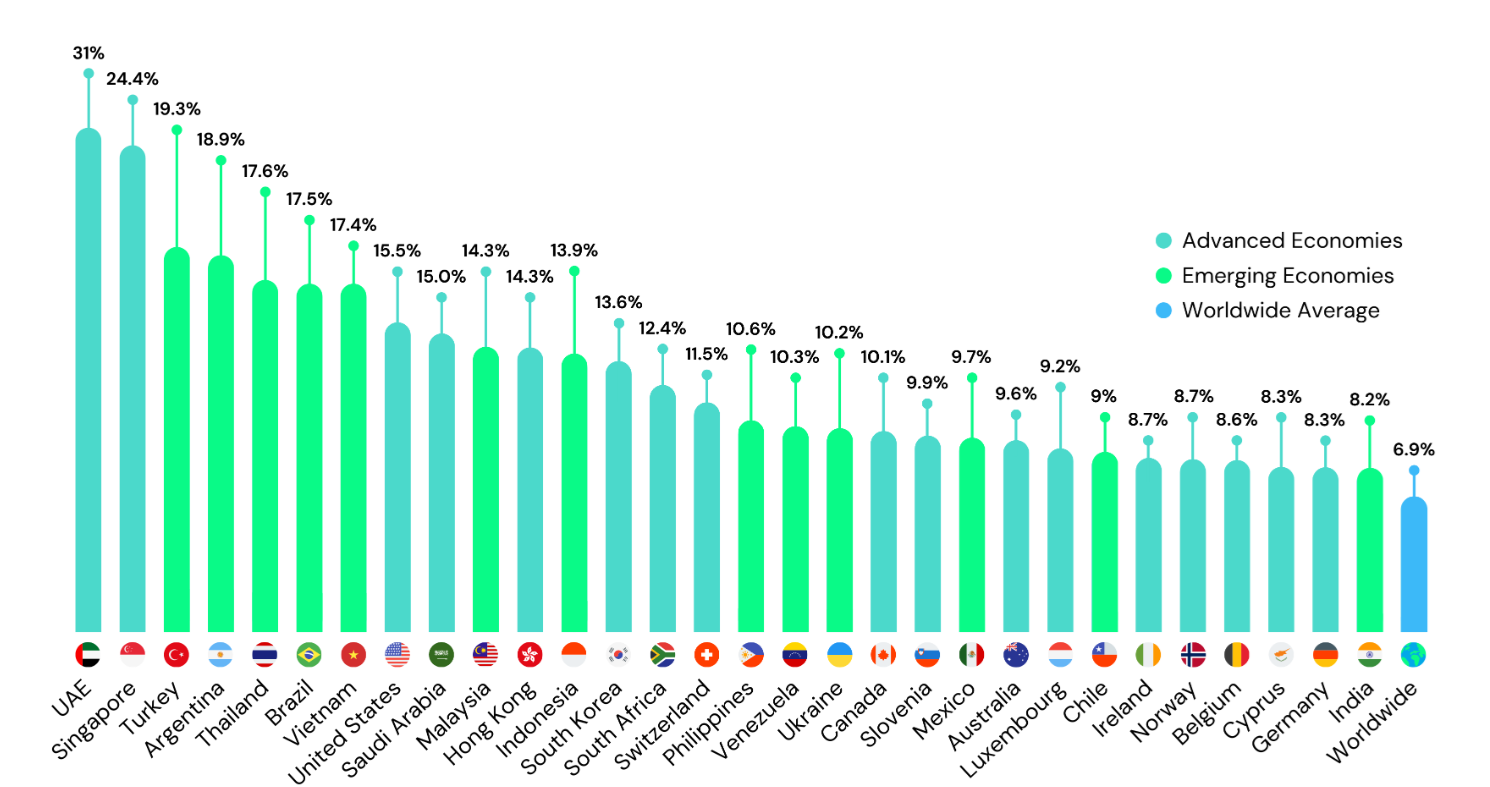 The USA is a powerhouse of transactions and institutional activity, but crypto ownership is comparatively low | Source: Triple-A