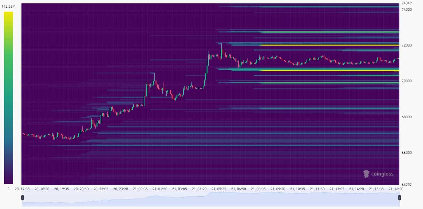 CoinGlass data indicated $70,600 as the area with the thickest bid liquidity below the spot price at the time of writing.