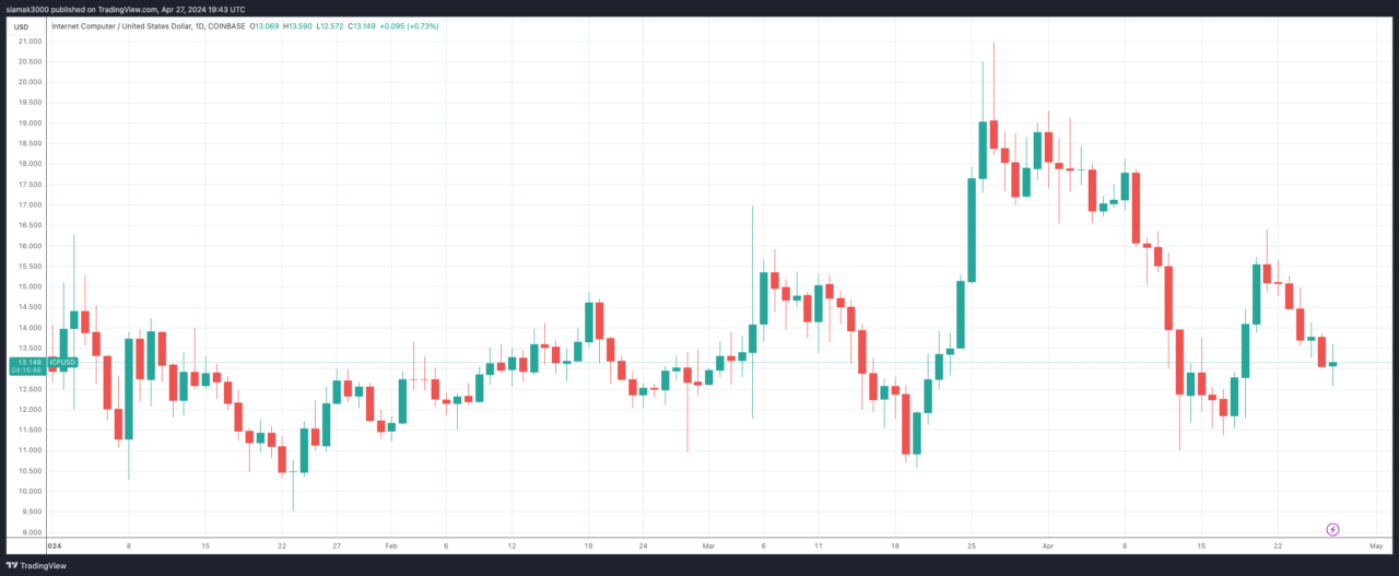 At the time of writing (7:45 p.m. UTC on April 27), ICP is trading at $13.15, down 0.9% in the past 24-hour period but up 131.1% in the past one-year period.