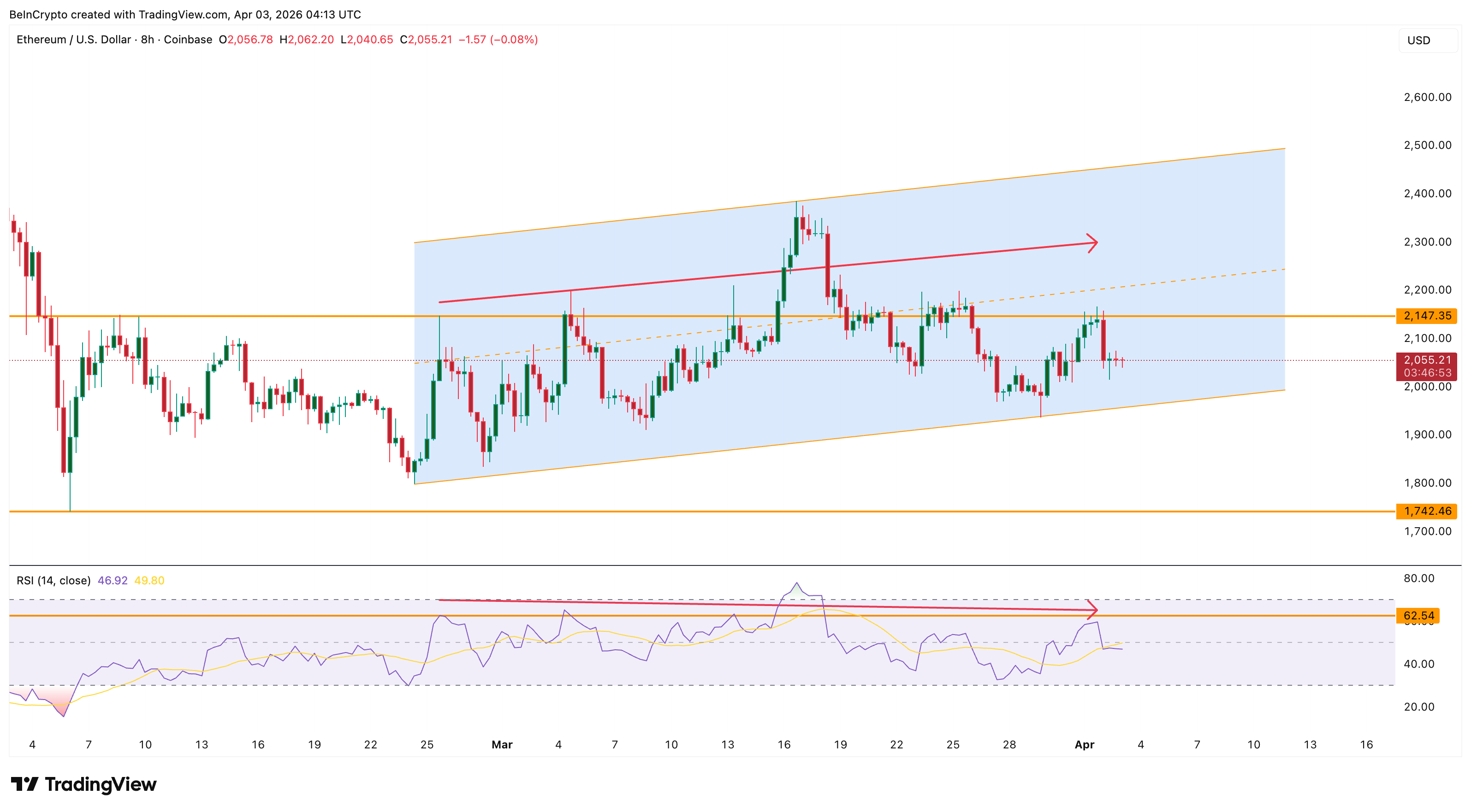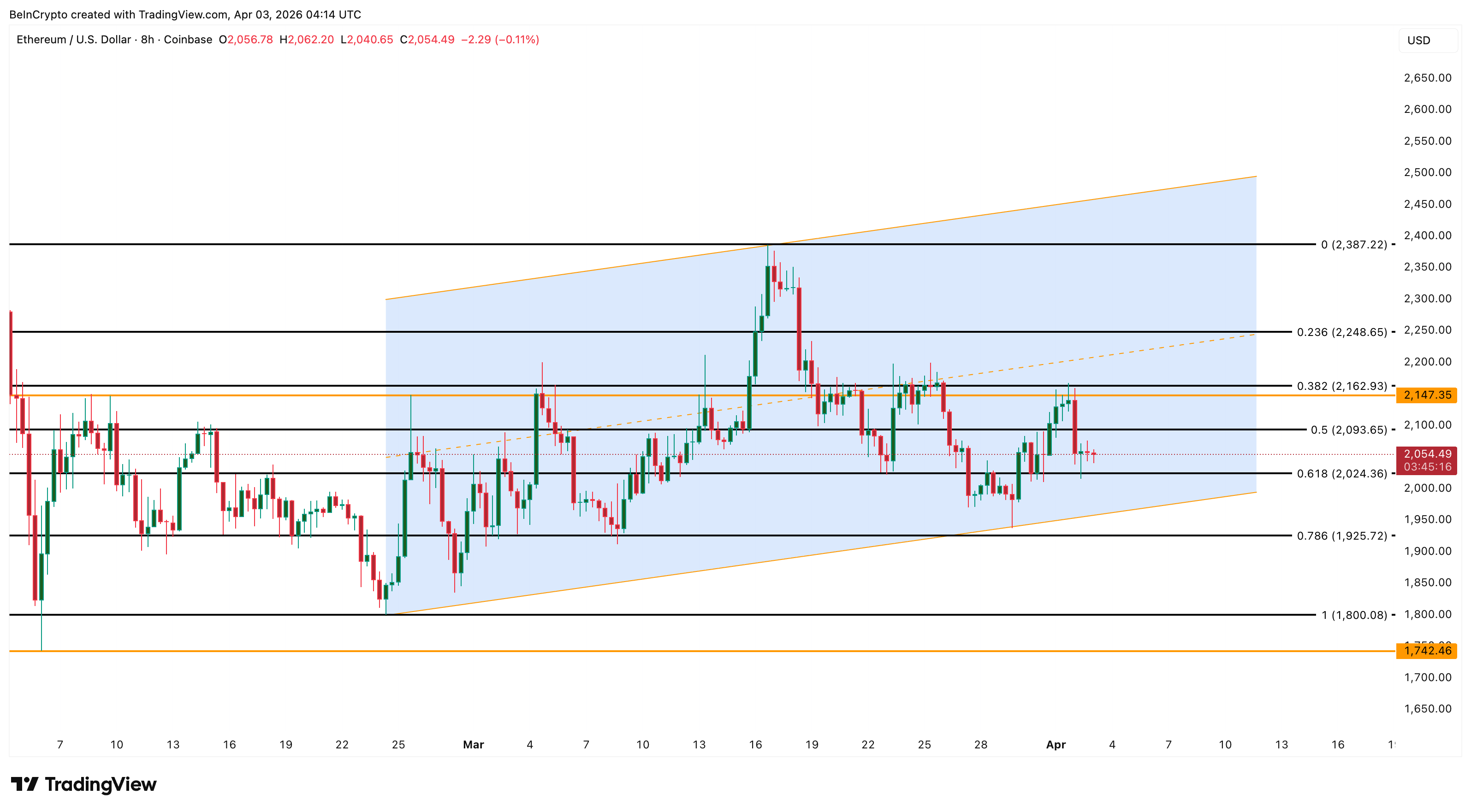 Ethereum ($ETH) price trades near $2,055 on April 3, sitting inside an ascending channel on the 8-hour chart that has guided price action since February 24.