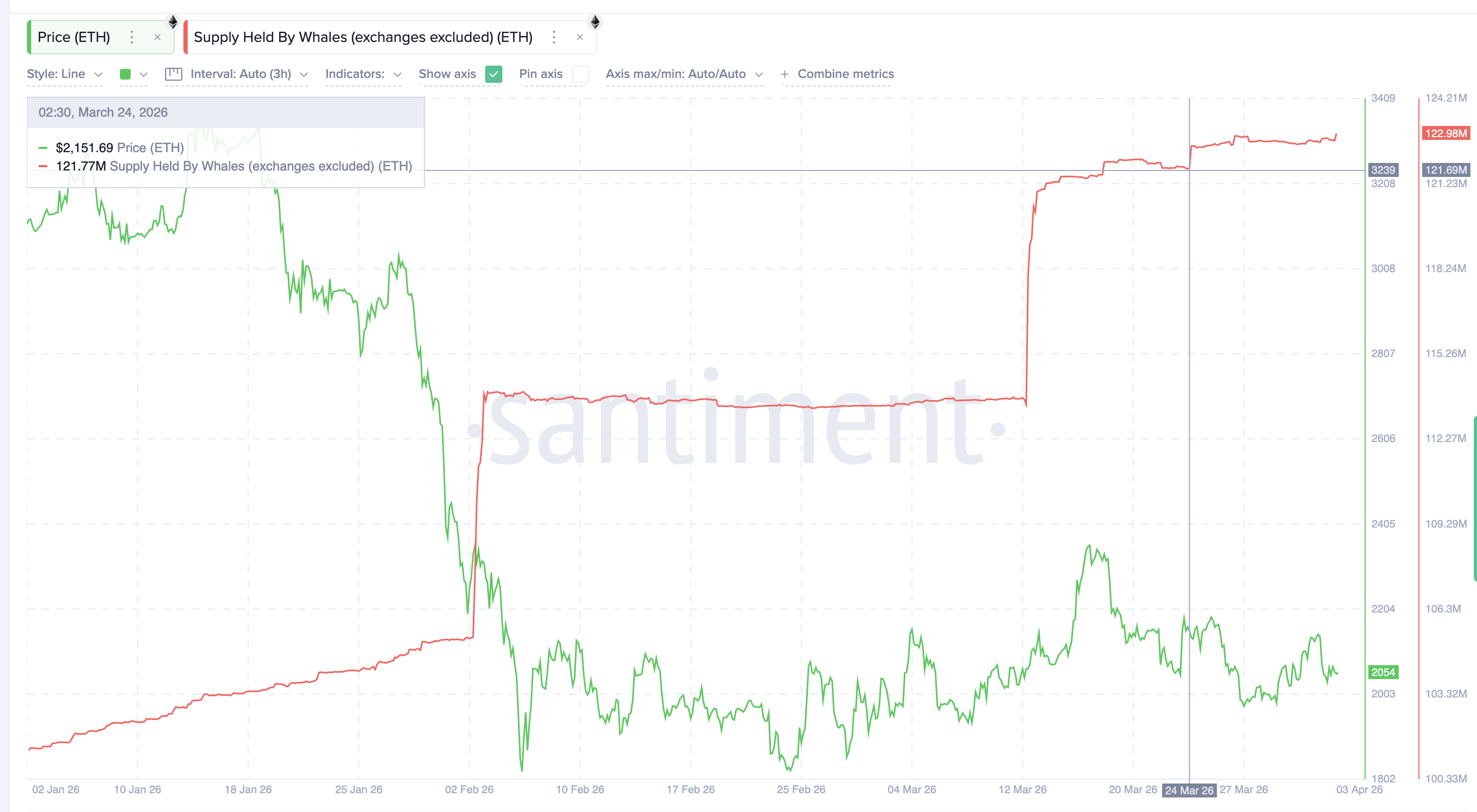 On-chain data from Santiment shows that Ethereum whales, wallets excluding exchange addresses, have been steadily accumulating since March 24. On that date, whale supply stood at 121.69 million $ETH. By April 3, the figure had climbed to 122.98 million $ETH, an addition of approximately 1.29 million tokens.