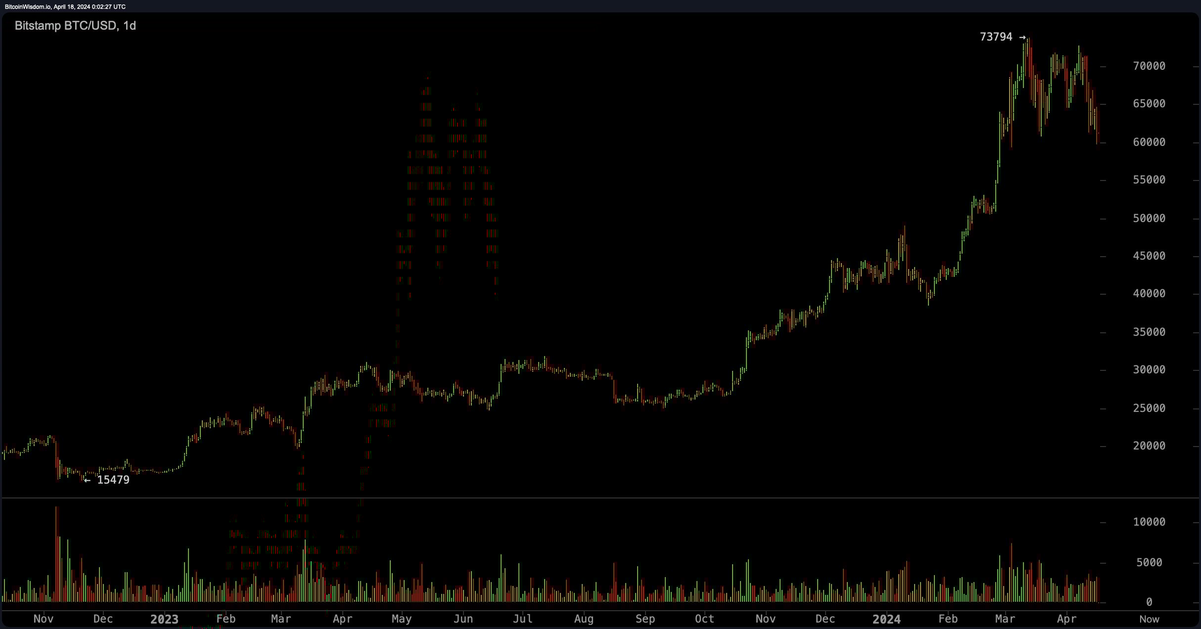 Over the past 12 months, BTC has risen 107% between April 17, 2023, to April 17, 2024. It reached an all-time price high of $73,794 per unit on March 14, 2024.