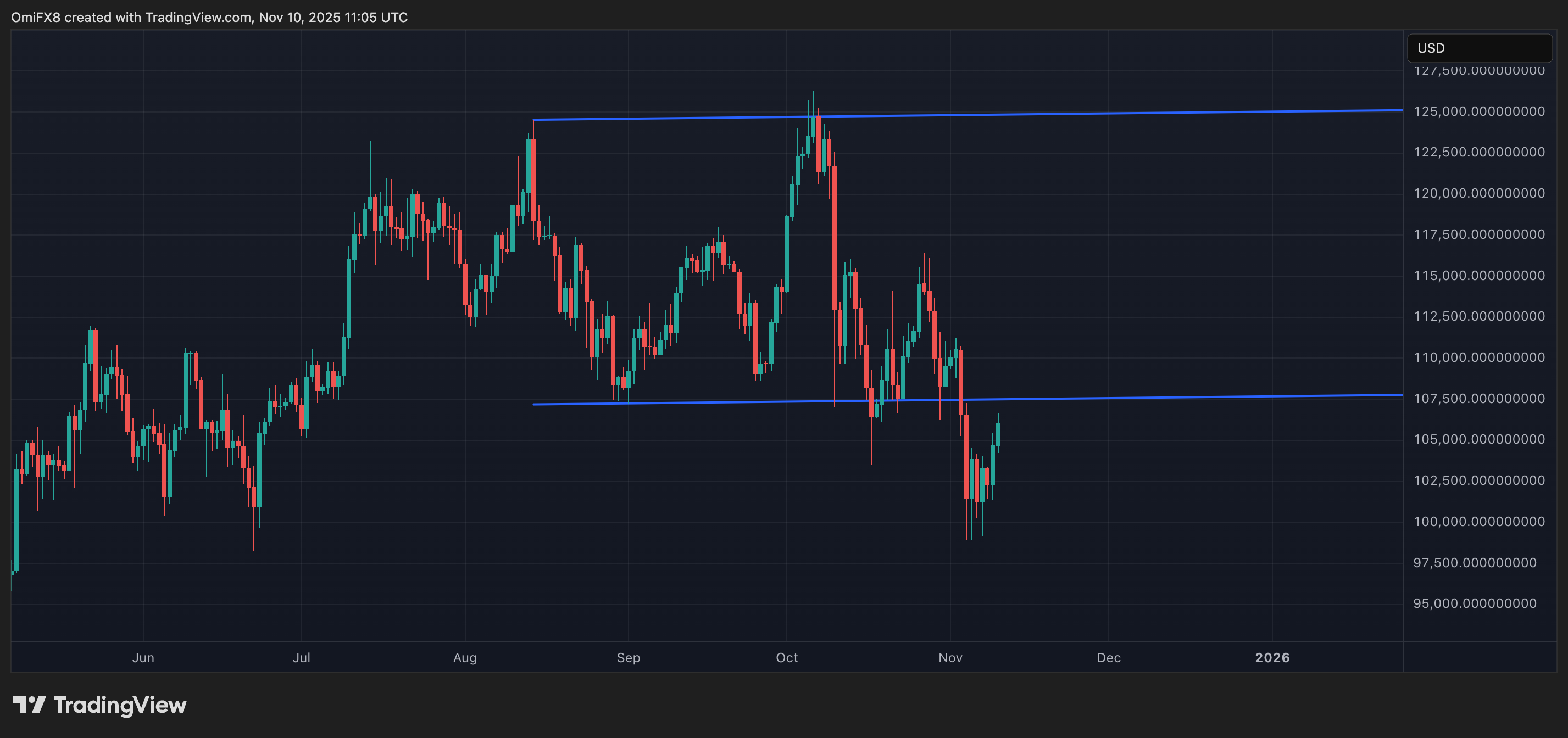 - Conversely, a bull failure would reinforce the range breakdown, potentially leading to a deeper sell-off below $100,000.
