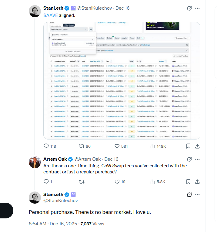 Alongside the SEC and masterplan announcement, Kulechov capped things off on Tuesday by sharing that he had personally purchased $9.8 million worth of AAVE, outside of the Aave DAO’s proposed buyback program.