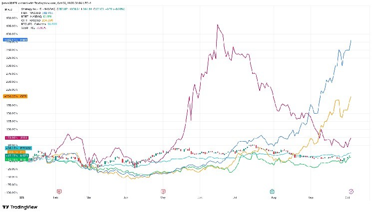 The wide gap in gains highlights how investors are favoring some Bitcoin-exposed firms over others, underscoring a growing divergence within the sector.