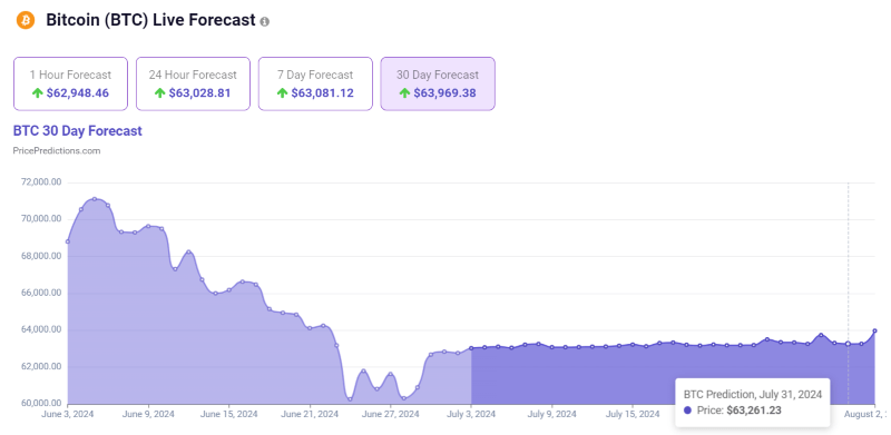 Regarding its performance in the upcoming weeks, the advanced AI algorithms at work over at the cryptocurrency monitoring and forecasting platform PricePredictions have projected it would turn positive and hit $63,261.23 on July 31, 2024, according to the data on July 2.