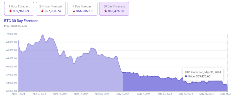 As for its future performance, the advanced AI algorithms do not see Bitcoin’s troubles ending in the next few weeks, predicting it would hit the price of $53,476.60 by May 31, 2024, as per data shared by crypto analytics and forecasting platform PricePredictions on April 30.