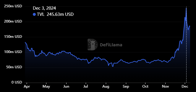 The blockchain’s total value locked soared from November 1 at $69.5 million to $245.63 million (the second-highest in history) on December 3.