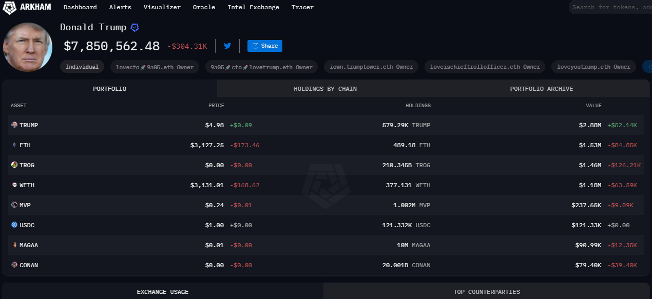 According to Arkham Intelligence data, Donald Trump’s crypto assets have fallen 75% since June to $7.85 million.