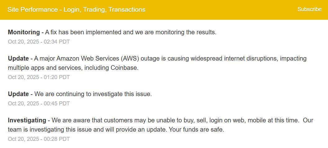 Coinbase and Robinhood were among several major platforms affected by an Amazon Web Services (AWS) data center outage on Monday, underscoring the risks of relying on centralized cloud providers for critical financial infrastructure.