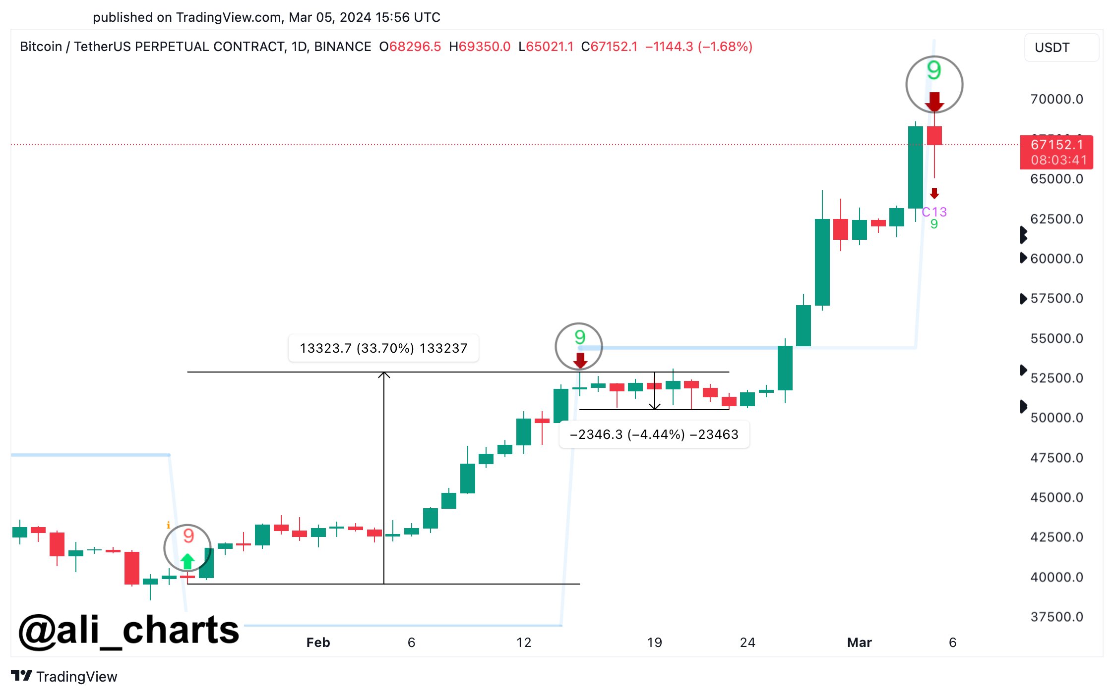Martinez took to the social media platform X (formerly Twitter) to share his projections with the crypto community. According to Ali Martinez, on the daily chart of Bitcoin, the Tom DeMark (TD) Sequential indicator presently “flashed a sell signal.”