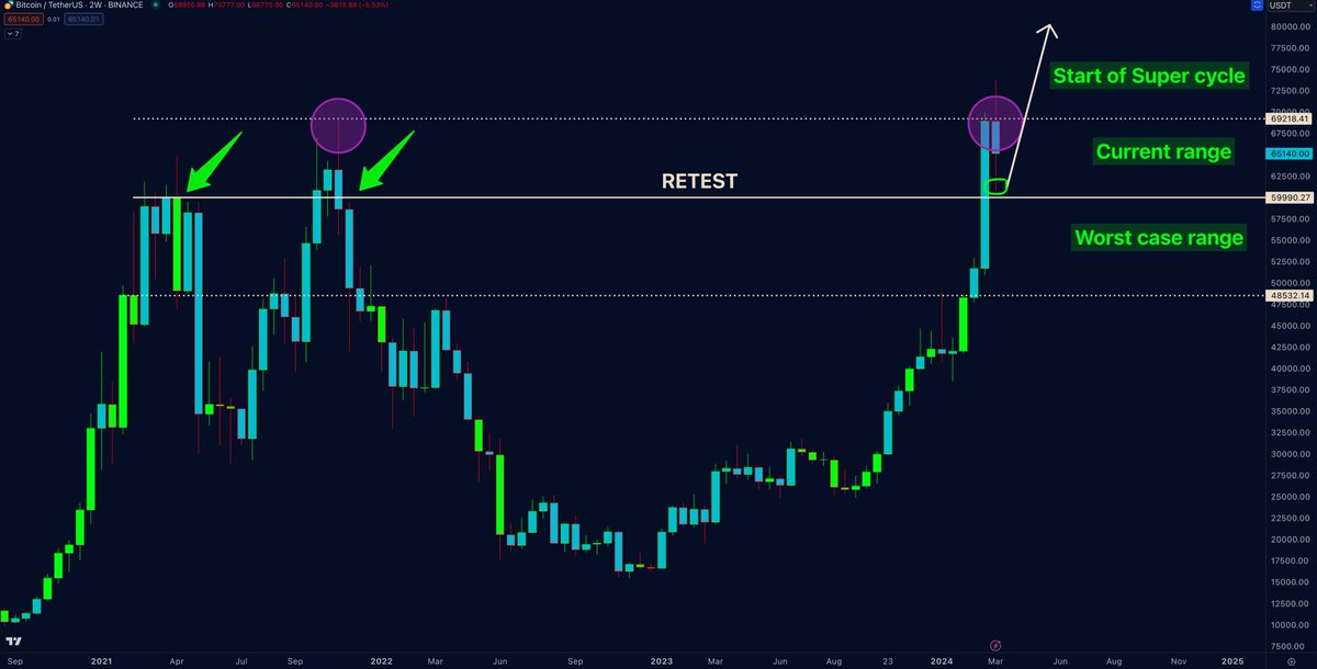 Doctor Profit seems to be pleased with Bitcoin retesting its previous ATH level in the $60,000 range. He highlights the potential of Bitcoin and the slow transformation of the $60,000 resistance level into a solid support point, paving the way for the upcoming super cycle similar to other ATH breakouts.