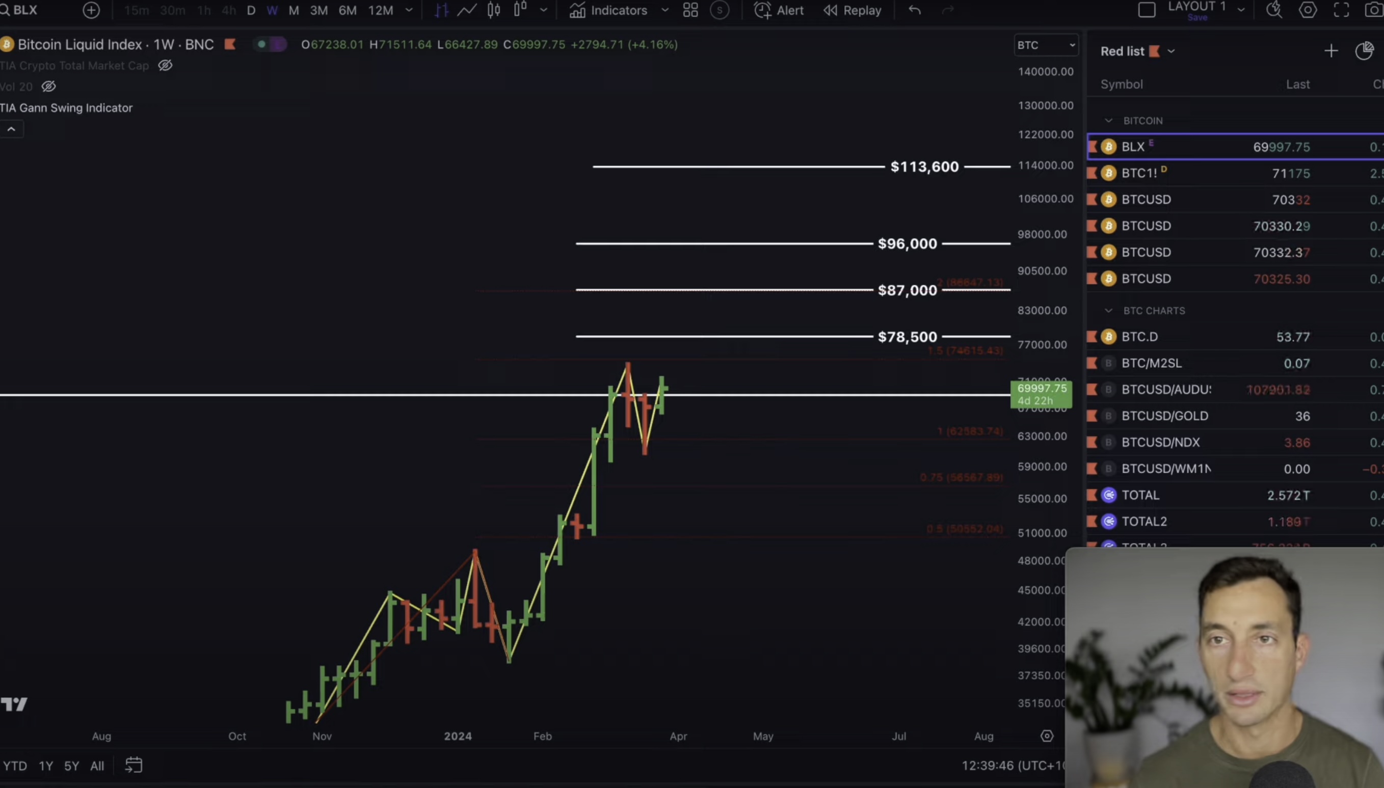 “Looking at some price targets. $72,500, get past that, obviously the all-time high at $74,000. My next two targets are $78,500. That one is based on this level here: we’ve got our extension tool from the weekly swing, so the low of the ETF (exchange-traded fund) [launch in January] to the top, projected off the current low, and 50% comes in at $78,400. Now the 100% is at $81,000.