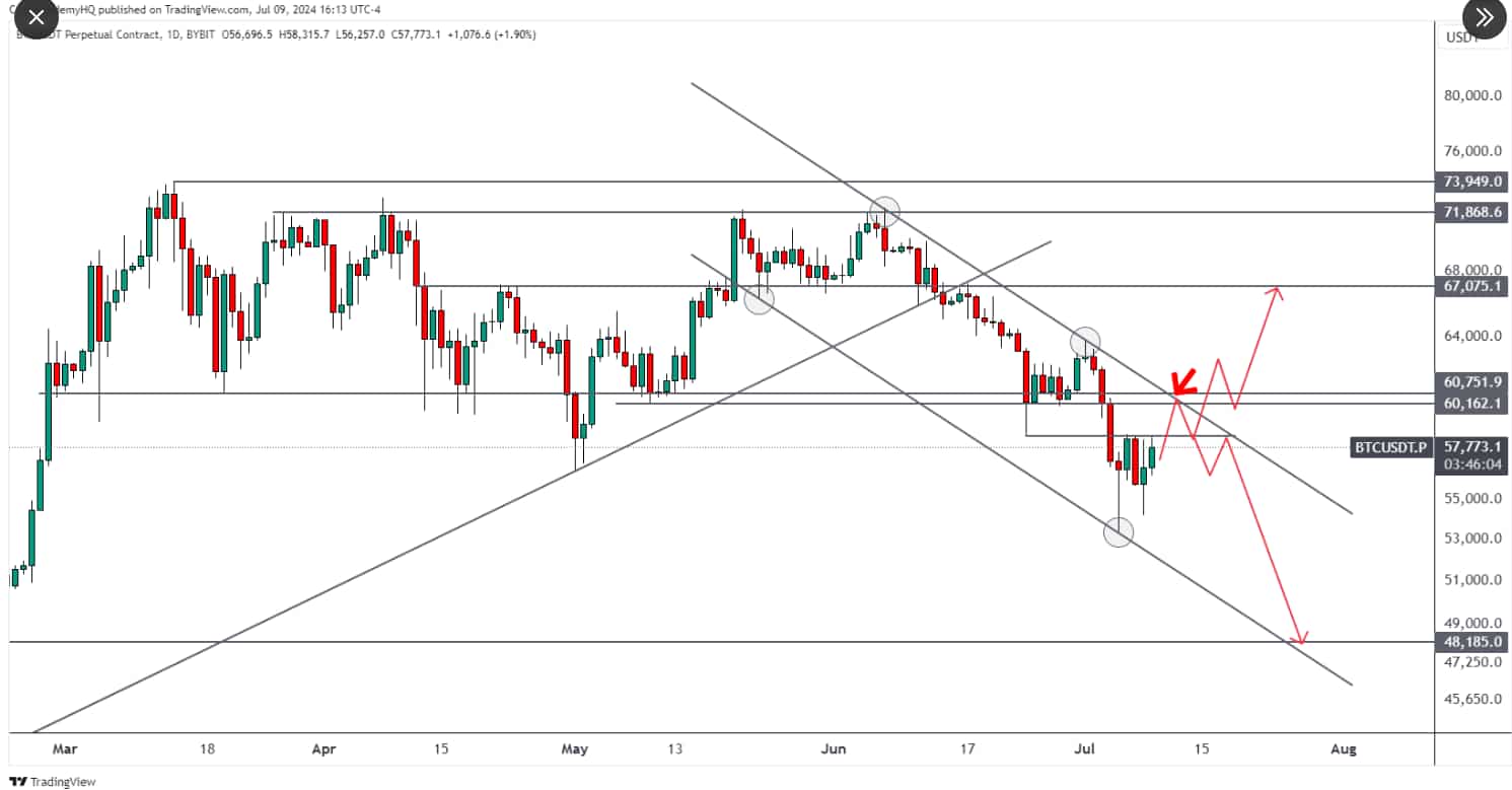 Bennett’s analysis of the BTC/USDT chart indicates a critical juncture for Bitcoin. After a sustained downward trend, Bitcoin has reached a support level near $57,773. The price is currently testing the resistance zone between $60,162 and $60,751. In his analysis, he outlined two scenarios – bearish rejection and bullish rebound.