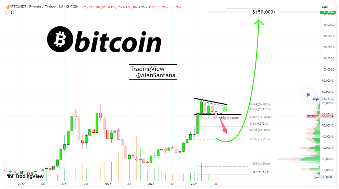 When looking at the next play for Bitcoin, Santana pointed out that should Bitcoin continue to stay below $60,000, an extended negative market condition could emerge. Referring to the massive green candle in February 2024, the expert explained that a similar but opposite reaction could occur on the bearish side, potentially driving prices down to test lower levels such as $50,000, $40,000, and even $30,000.