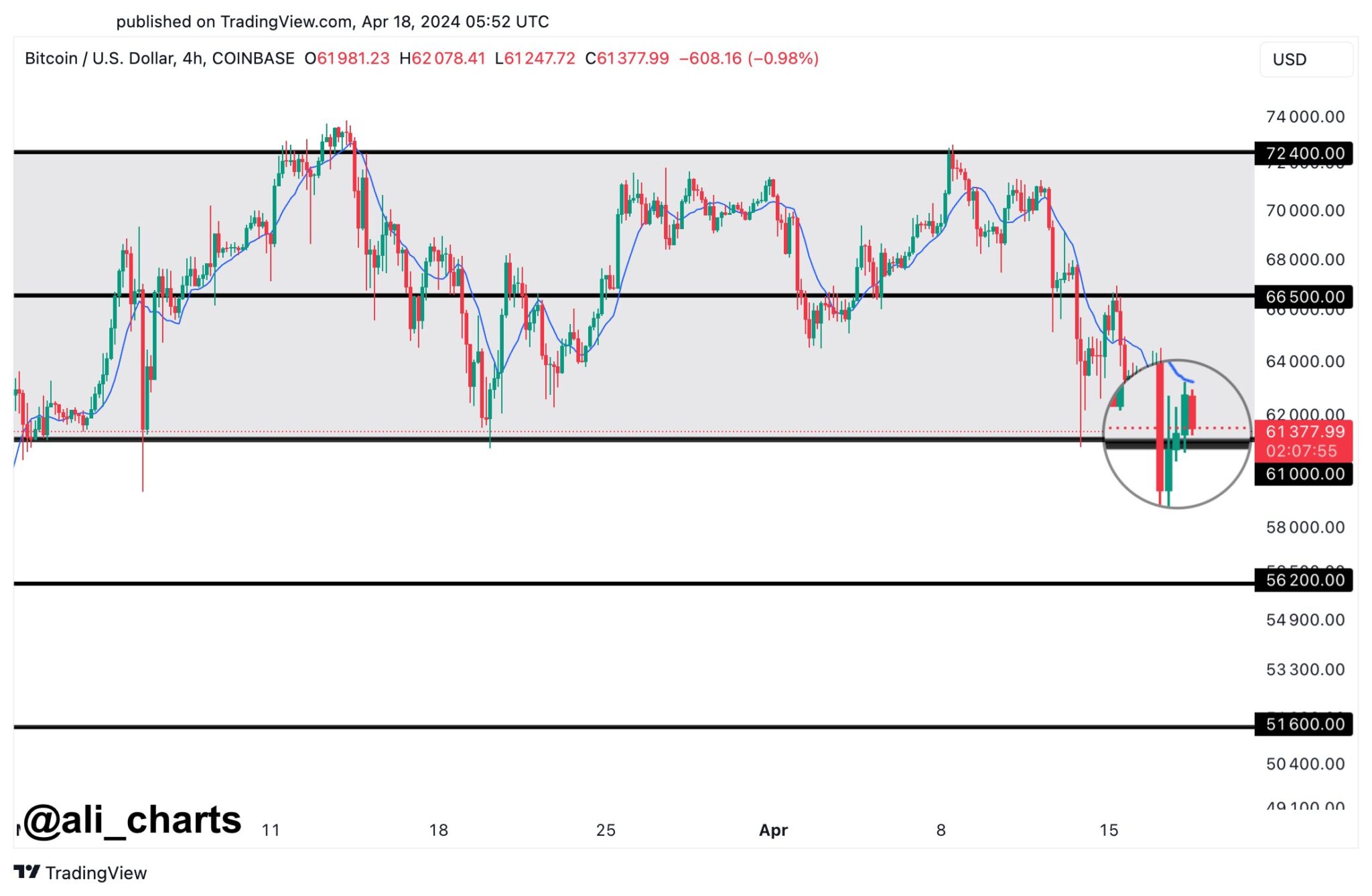 Crypto analyst Ali Martinez highlighted in an X (formerly Twitter) post on April 18, that Bitcoin had entered a consolidation phase within a defined trading channel, identifying $61,000 as a critical support level.