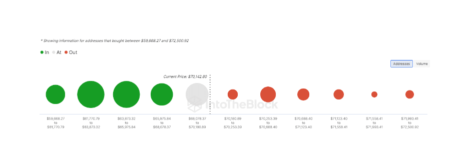 Adding a layer of depth, analyst Ali points out that the supply zone between $70,180 and $70,600 is particularly critical, hosting over 450,000 addresses that collectively hold around 273,000 BTC. This concentration could pose substantial resistance due to the significant amount of Bitcoin held in this range.