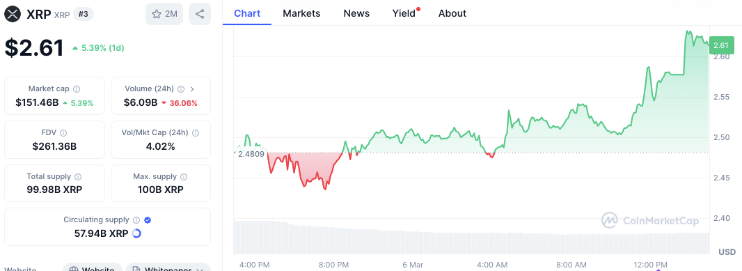 In over 24 hours, the price of XRP jumped by 5.39%, reaching $2.61. This move up may be related to growing optimism about the lawsuit’s ending or investor sentiment around Ripple’s potential future in the crypto market.