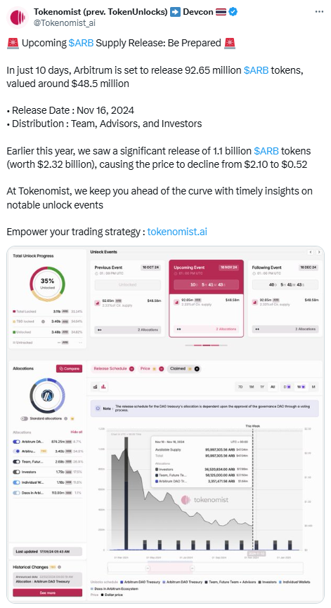 Arbitrum is approaching another major token unlock, scheduled for November 16th, 2024. Token Unlock data shows that 92.65 million ARB tokens, worth roughly $48.5 million, will be released, primarily to the Arbitrum team, advisors, and investors. This event has sparked considerable interest due to the price volatility seen after previous unlocks.