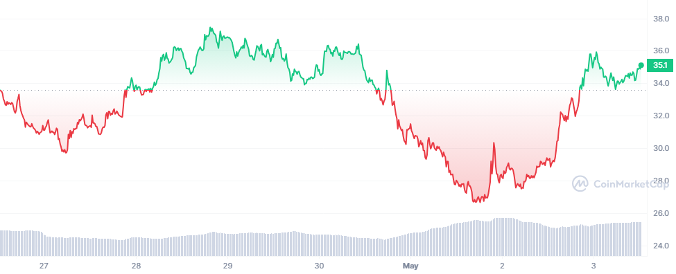 AR traded at $35.07 with volumes close to $200M in 24 hours and $355K in liquidity for 2% slippage. AR remains in the green on the weekly chart, as the project entered the top 50 of coins based on market capitalization.