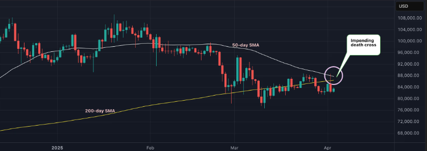 While Bitcoin was holding on to $82,000 in the decline it experienced after Trump’s tariff announcement, the death cross alarm was sounded.