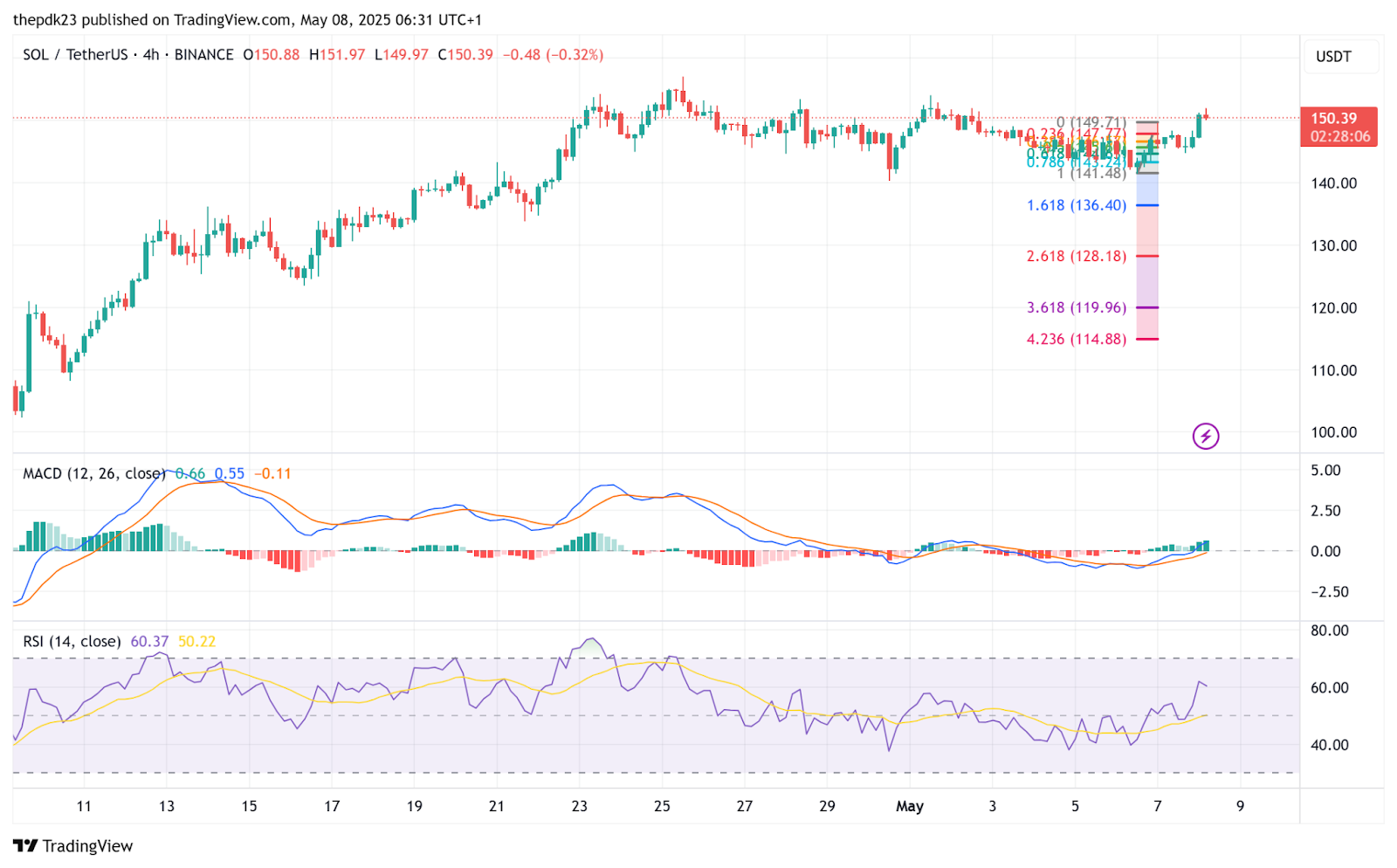 Turning to the charts, SOL’s price action shows building bullish momentum on the 4-hour view. On the 4-hour chart, SOL bounced from a local support near $141.48 (Fib 0.786 level) and is now testing resistance around $151.97.