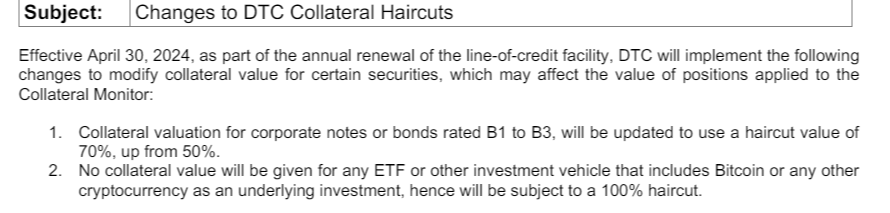 DTCC will not allocate any collateral for BTC ETFs