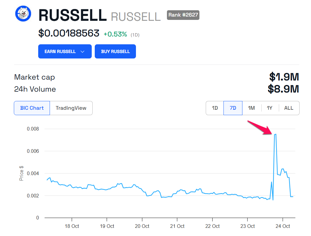 RUSSELL’s market cap briefly exceeded $10 million, only to fall back to $1.9 million a few hours later. Its price also returned to $0.0018.