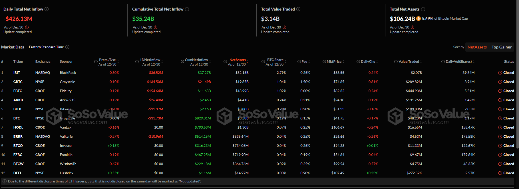 As the market experiences a pullback, institutional support for Bitcoin declines. On December 30, the daily total net inflow of the U.S. spot Bitcoin ETF registered an outflow of $426.13 million.