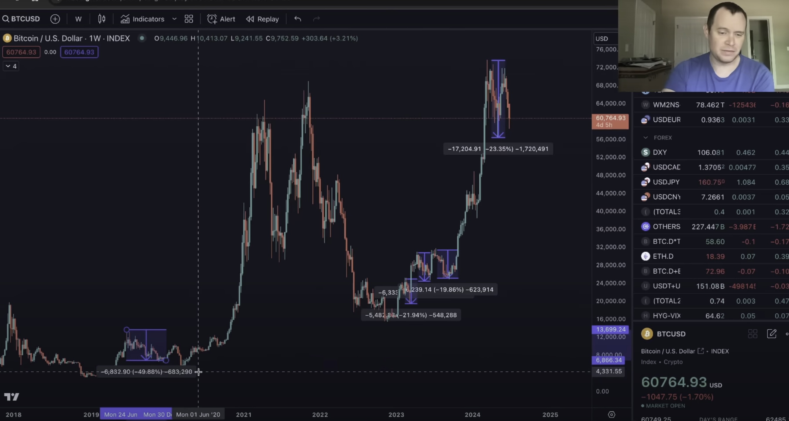 “We really haven’t had that many large pullbacks. A lot of these pullbacks have actually been relatively muted, especially compared to last cycle. These pullbacks are basically just like 20% pullbacks, essentially all of them. Even this one [in May 2024], it was still only about a 23% pullback. So last cycle, after that 2019 top, we ended up getting about a 50% pullback. Obviously, it went further down because of the pandemic later on…Even in the 2016 camp, there were still some larger pullbacks like 30% and 40%.