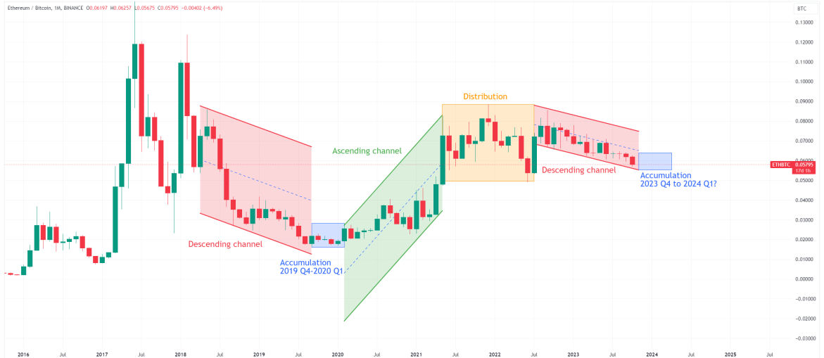 Ethereum has been in a descending channel against Bitcoin since August of last year, meaning Bitcoin has been the better investment over this time. However, historical trends show the tides could be changing soon, with Ethereum possibly on the brink of entering an accumulation phase.