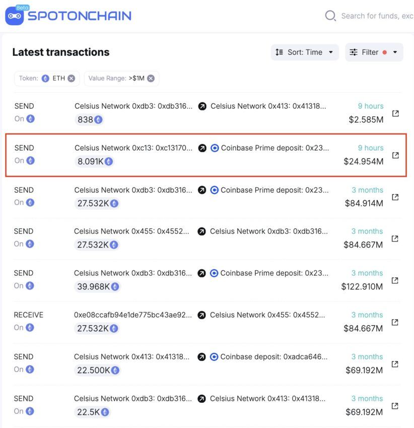 Celsius Network’s Latest Transaction to Coinbase. Source: Spot On Chain