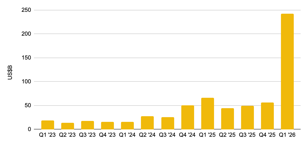 Interestingly, insights from research firm Gartner project that worldwide AI spending will reach $2.52 trillion in 2026, up 44% year over year, while Crunchbase estimates AI accounted for about $242 billion, or roughly 80% of global venture funding in the first quarter alone.