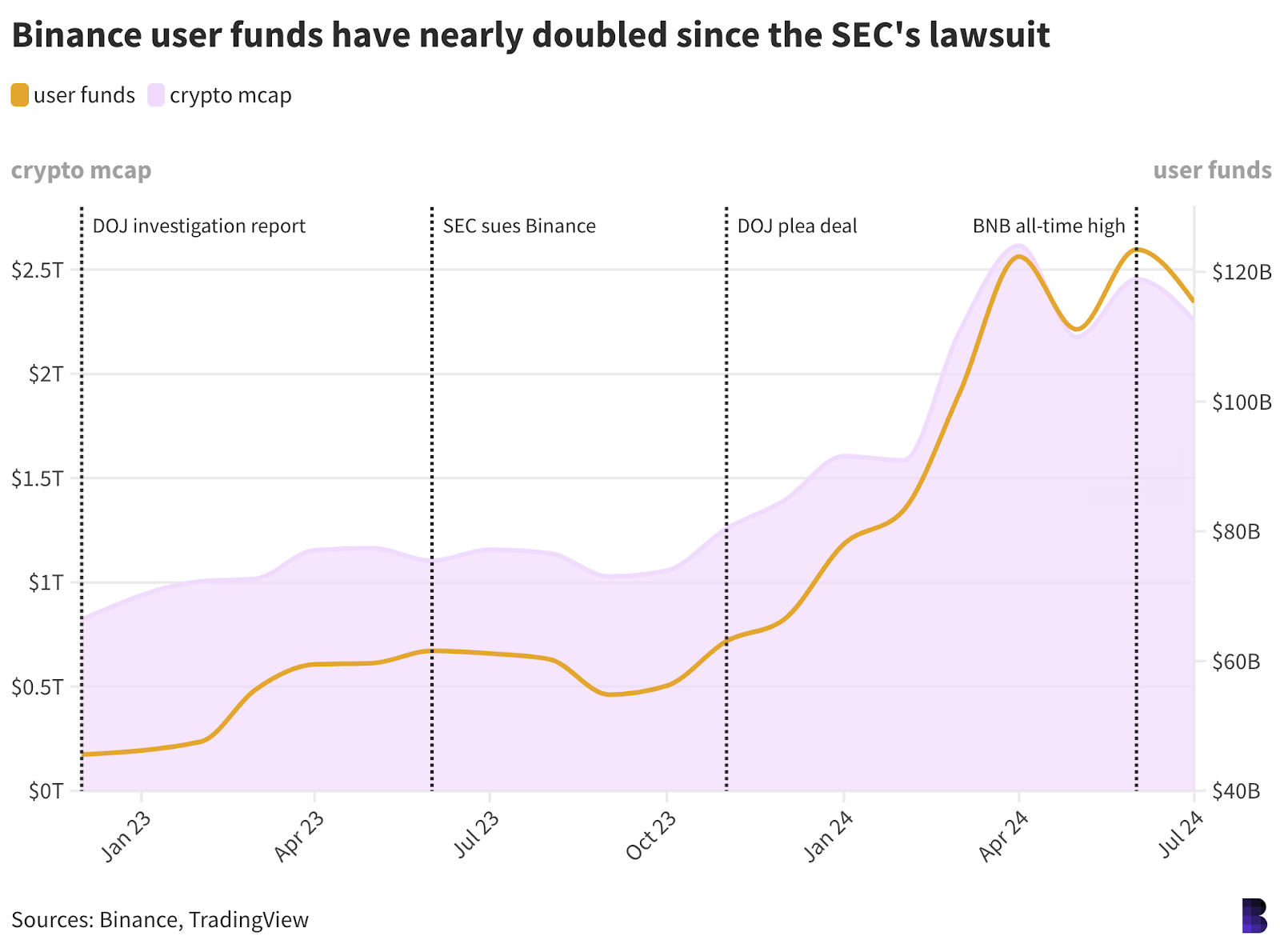 The dollar value of user deposits obviously rises alongside prices, but the purple area and the orange line would decouple if there were any meaningful user exodus. It could also be that US intervention actually boosted confidence in Binance overall.
